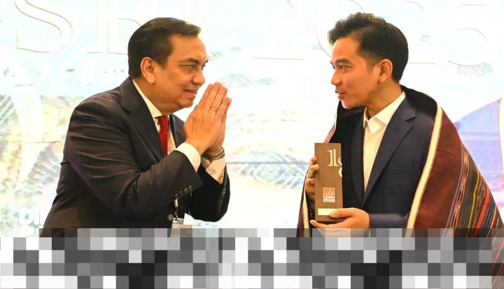 Di sebuah foto yang menarik perhatian, dua generasi politik terlihat saling berhadapan. Di sisi kiri, terdapat seorang politisi senior dengan gestur tangan yang menunjukkan kedekatan, tubuhnya sedikit condong ke depan, dan wajah yang tidak lagi menampilkan ketegasan. Dia adalah Effendi Muarasakti Simbolon, seorang mantan politisi berpengalaman dari PDIP dan mantan anggota parlemen. Di hadapannya, berdiri seorang tokoh muda, Wakil Presiden Gibran Rakabuming Raka, yang menatap dengan percaya diri sambil memegang simbol pencapaian. Suasana tampak tenang; tidak ada teriakan atau interupsi, hanya ada pengakuan yang tersirat mengenai posisi masing-masing.
